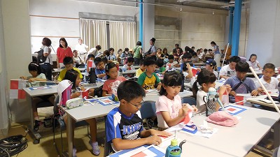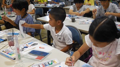 講師(美術家)指導により、午前プログラムでの港内探検をもとに、みなと、「海」、船などをテーマに、全員がガラス絵に挑戦しました。。「ガラス絵」は親子とも初体験でしたが、アート表現に真剣に取り組んでいました。