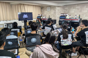 写真左:初めて3Dモデリングソフトを使い操作方法を実践形式で学ぶ研究生たち