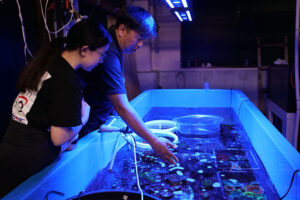 写真右:蛍光色を発するサンゴなどを育成する水槽を前に、質問する研究生