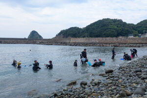 目﨑拓真所長をはじめとする研究員の方々に導かれ、研究生たちはシュノーケリングと磯探索へ。