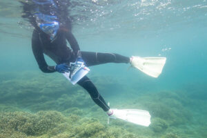 写真右:サンゴの被度を観察する研究生。持っているのは水中でも書ける特殊な用紙