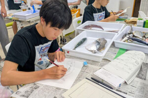 午後は、海洋生物の形や色、体のつくりを詳しく観察し、資料と見比べて正しい名前や種類を特定する「海洋生物同定実習」。その後スケッチと魚類の解剖を通じて、生命の精巧な仕組みに迫りました。
