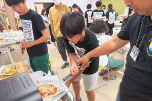 合宿2日目と3日目の夕食は特別メニュー。自分たちで具材をトッピングし一枚ずつ焼き上げたピザと地元で採れた新鮮な魚のお刺身やたたき、解剖したイカを使ったイカカレー。海の恵みを五感すべてで味わう、贅沢な体験となりました。