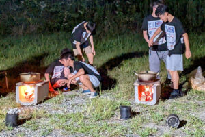 写真右:解剖したイカを使ってイカカレー作り。飯盒炊さんは、火起こしからチャレンジ。