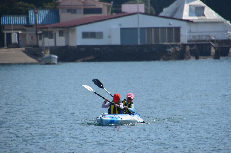 2名ペアで息を合わせてパドルを動かしカヤックを進めます。二人の息が合わないとなかなかうまく進むことができない乗り物です。仲間との協調性を学ぶことができるマリンスポーツのアクティビティを実施しました。