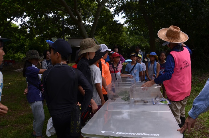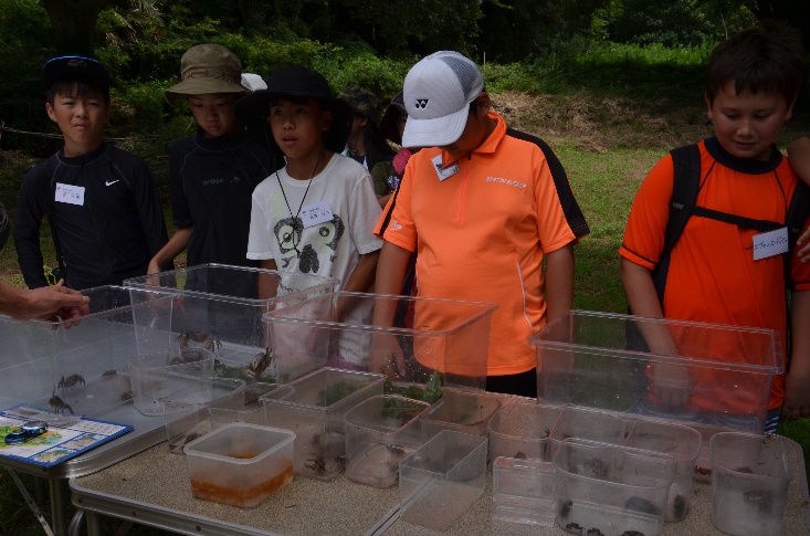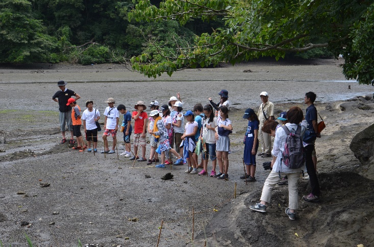 海なし県である群馬県伊香保町の子どもたちにも海の楽しさが理解できるように、小網代の干潟での生物観察を行いました。小網代野外活動調整会議のガイドを依頼し、小網代の自然の説明や干潟の生物の説明を聞きました。伊香保町の子どもたちは、普段触れることのない生きものに興味津々でした。