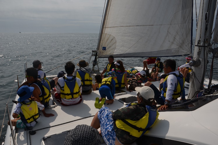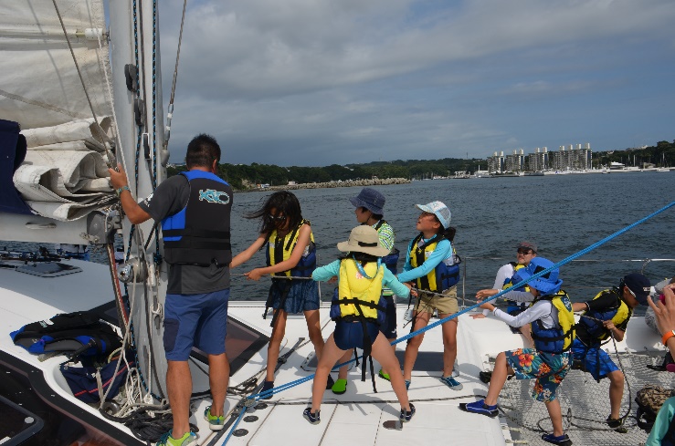 大型カタマランヨットを使用し、子どもたちが操船を体験しました。子どもたちだけでセイルを上げ、実際に風の力を使って船を動かすセーリング体験です。