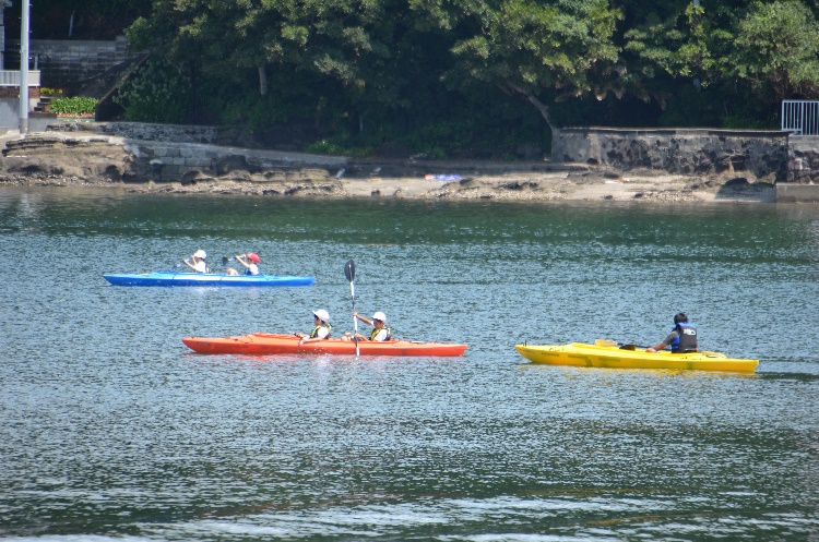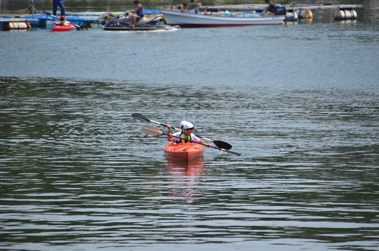 2名のペアで息を合わせてパドルを動かしカヤックを進めます。二人の息が合わないとなかなかうまく進むことができない乗り物です。仲間との協調性を学ぶことが出来るマリンスポーツのアクティビティを実施しました。小学5年生でも無理なく漕ぐことができました。