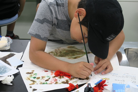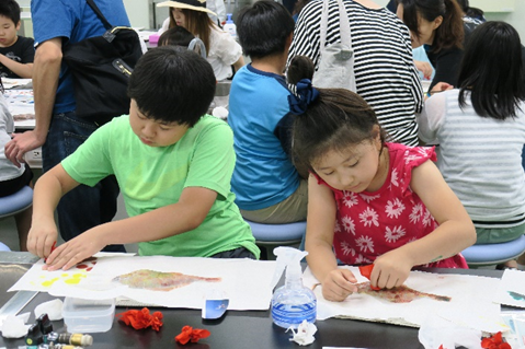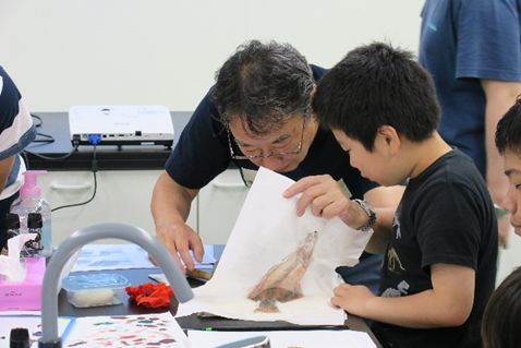子ども1人に対し1尾のカレイが配布され、子ども4人の1グループに対して1人のスタッフが対応し、丁寧に指導を行いながら、魚の上に和紙を載せ、水を含ませ、絵具で彩色していきました。彩色が進むごとに、だんだん魚の色が複雑になり、立体感も出てきました。子どもたちも、実際の魚を観察したうえで、色を忠実に再現しようと懸命に作業に臨んでいました。彩色が終わると、和紙を魚から剥がしていきましたが、子どもたちは、和紙が破れないように慎重に剥がしていました。