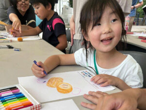 仙台としては前例のない暑さの中、事前のお申し込みの方や当日お祭りに来て参加いただいたお子様たちで会場は大賑わい!各ブース定員以上の参加者が集まり、お仕事体験は大盛況でした。「南三陸化石発掘のお仕事」では、仕事内容がわかりやすく1日3回開催のお仕事体験があっという間に埋まりました。また「缶詰制作のお仕事」石巻の缶詰加工販売会社木の屋石巻水産のお仕事は、缶詰に自分の夢を詰めてタイムカプセルのような缶詰を自分で作るお仕事。さらに絵を描くのが好きなお子様たちが集まった「かね久の新商品規格外の牡蠣を使った牡蠣クリームコロッケ商品PRポップ制作」。色々なアイデアを盛り込んだ個性的な力作POPが完成しました!規格外の牡蠣の存在や海の問題にも触れた完成したPOPは、実際にスーパーの店頭で飾られます。そして、牡蠣の稚魚をつけるホタテ貝のお家作り(採苗器)体験も大人気!牡蠣を知らない子供達も自分たちが作ったホタテのお家を漁師さんに海で使ってもらえることを、とても喜んでいました。参加者のご両親も興味津々でした!