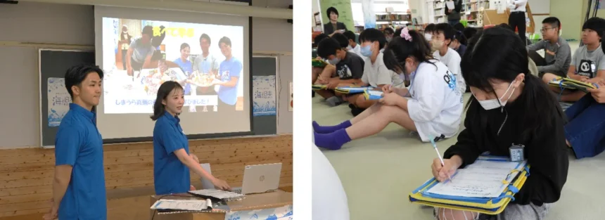 授業では、「宮崎の海とはどのような場所なのか?」という基本的な問いからスタートし、「宮崎の海の魅力」や「宮崎県北部の海の特徴」について学びを深めました。さらに、山・川・海がどのようにつながっているのかにも注目し、山や川から流れ込む栄養豊富な水が、日向灘の海の豊かさを育んでいること、生態系の恵みを受けるには生物多様性が重要であることを学びました。