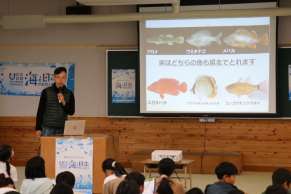 次は、宮崎大学農学部農学科 海洋生命科学コースの准教授・村瀬敦宣(むらせ あつのぶ)先生です。授業では、「宮崎の海とはどのような場所なのか?」という基本的な問いからスタートし、「宮崎の海の魅力」や「宮崎県北部の海の特徴」について学びを深めました。さらに、山・川・海がどのようにつながっているのかにも注目し、山や川から流れ込む栄養豊富な水が、日向灘の海の豊かさを育んでいること、生態系の恵みを受けるには生物多様性が重要であることを学びました。