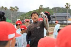 この日は、同町で民宿を営む甲斐宏明さんを講師に迎え、地引網漁の歴史や仕組み、注意点などをレクチャーしていただきました。甲斐さんの「今日は獲れた魚がお昼ご飯になります!一生懸命漁をして、美味しい魚を食べましょう!」という言葉に、子どもたちは目を輝かせながら漁に挑戦しました。