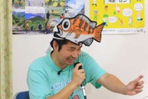 続いては、食べた魚は526種類、釣った魚は392種類、日本さかな検定1級を持つ、魚を愛するさかな芸人ハットリさんによる授業です。本日のテーマ、未利用魚についてのお話です。未利用魚とは、市場に出回ることが少ない魚、破棄される魚のこと。ハットリさんはこれまで食べた深海魚の話や、おいしいけど知名度の低さや文化の違いで活用されない魚があることを子どもたちに伝え、この未利用魚の利用法を考えることが、今後の魚を守ることに繋がるということを話しました。さかな芸人ハットリさんは「魚を食べるでもいい、水族館に見に行くのでもいい、釣りをするでもいいから魚を好きになってくれると、その気持ちがこれから海や魚を守っていくことに繋がるので、魚を好きになってほしいです」と話しました。