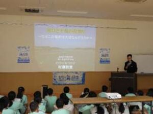前半は宮崎大学・西田教授による講義で、延岡の海に生息する生き物の多様性と、環境問題が生き物たちに与える影響について学びます。