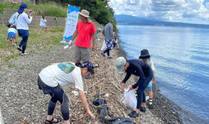 アクティビティ参加者たちはインストラクターの元に集合し、まずは海洋ごみについて学びました。プロダイバーで大村湾の海洋ごみ問題に詳しい中村氏より「海洋ごみの約8割は陸から発生しています。街で捨てられたごみが川を伝って海に流れ出ているんです。大村湾は超閉鎖性海域といい、大村湾のごみは外にでていきにくく、外から入ってきにくい特徴があります。ということは、大村湾のごみは大村湾の周辺地域から出たごみがほとんどなんです。周辺地域のみんながごみを出さない努力をすることで、美しい大村湾は守れるんですよ!」と伝えると、参加者は真剣な表情で話を聞いていました。そして「二島には大村湾周辺から出て流れ着いたごみがたくさんあります。みんなでごみ拾いをして二島をキレイにしましょう」と話し、全員でごみ拾いをしました。