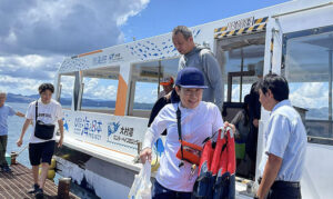 二島から長与港へ戻る船で、「二島の海の魅力を感じましたか?」「また二島に来たいですか?」と参加者へ問いかけると、全員が満面の笑みで元気に手を挙げました。