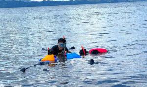 シュノーケリングでは、専門家の先生のもと、海の生き物を観察しました。「すごい!ウニ!」「ウミウシがいた!」「カニ!ヤドカリもいた!」など子どもたちの驚く声がたくさん聞こえてきます。生き物を見つけるたび、1匹1匹、どんな生き物なのか先生が説明し、子どもたちは興味深々で話を聞いていました。普段の大村湾ではなかなか触れ合うことができない生き物を観察でき、二島の海の特徴を感じることができたようでした。