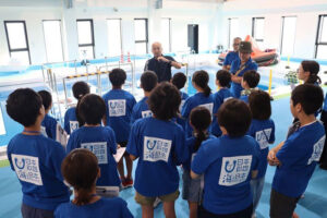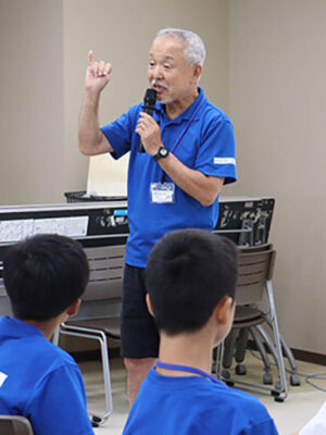 伊王島を離れ、高島に向かいます。高島にある高島水産研究所では卵から成魚まで一貫して育てる完全養殖」の実現を目指し、飼料や水温・光・水質制御、AIや海中ロボットなどを活用した養殖の「DX化」に取り組んでいます。座学で鰤について教えてくださるのは、長崎大学海洋イノベーション機構の有瀧教授。鰤は卵から成体になるまでおよそ1.5年、その間に0.0005gだった体重は800万倍の4000gにまで成長します。人間の赤ちゃんがゴジラクラスの体になる、という喩えに子ども達もびっくり。鰤は他の魚と比べ、成長速度に対するエサの量も比較的少なく、育てるためのコストパフォーマンスも良いのだとか。世界に向けて完全養殖の鰤を発信していくため名付けられた名前は「JAPAN鰤」子ども達もその可能性・スケールの大きさに興味津々でした。
