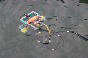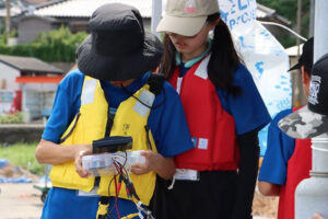 伊王島での体験はまだまだ続きます!西彼南部漁業協同組合近くの海中をドローンで調査します。ここでも教えてくださるのは長崎総合科学大学松岡教授。陸上から海の中を安全に見ることができる水中ドローンは、そのほとんどが未解明の深海の探査などにおいてとても重要な技術です。この日は水深が浅いエリアだけの観察でしたが、それでも陸上から目視できない魚やウニを見ることができ、子ども達は興奮していました。