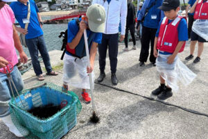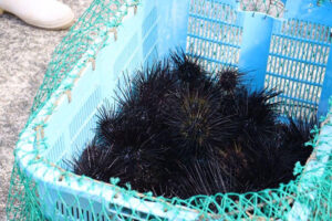 海中調査の横では、ガンガゼウニの駆除体験を行います。西彼南部漁協の葺本弘孝さんは、藻を食い尽くすガンガゼウニをボランティアで駆除していると話します。また、身の利用価値は少ないものの、トゲをハサミで切り落とし、釣り人のためのエサとして売り出すことで利用価値を見出しているそうです。しかし、地球温暖化のスピードと、ガンガゼウニの増え方にはボランティアの駆除だけでは間に合わず、藻は減少し獲れる魚の量は減っていると話します。