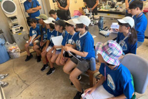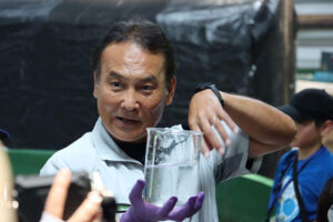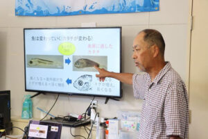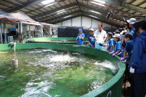 実際に養殖している鰤の見学もさせて頂きました。引率してくださったのは国立研究開発法人水産研究・教育機構の照屋部長。魚の大きさごとに水槽が分けられ、成長度合いに合わせてエサの種類、量が決められます。ここ、高島水産研究所は、海上ではなく陸上で魚の養殖・研究を行っています。陸上養殖では、濾過装置や冷暖房など、設備にお金がかかる分、環境を制御しやすいというメリットがあります。そのため、緻密な研究や分析に適しているのが陸上養殖です。生簀の外にある酸素供給装置や、濾過装置の大きさに子ども達も驚いていました。見学した生簀の中では産卵も行われるため、丁寧にネットで掬い、他の魚に食べられてしまう前に生育に必要な環境に移されます。卵は一度に数十万〜数百万産み落とされますが、自然界ではこの内数匹しか大人になれません。外敵のいない場所で魚を育てることができる養殖は、食料を守るため大変有意義な方法と、実際に大量の卵を見て子ども達も実感していました。「これから研究を進めて、近い未来美味しい”JAPAN鰤”をみんなが食べられるようにしたい」と照屋部長は話していました。