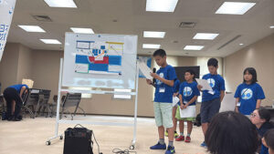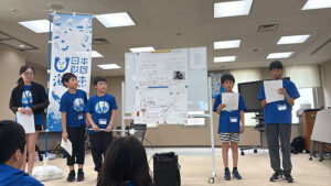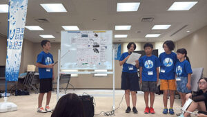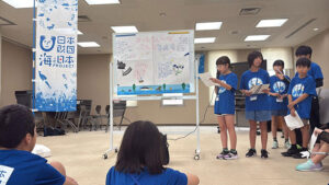 アウトプットのテーマは「長崎の未来の海」。長崎の海の現状・課題や、今各地で行われている先進的な取り組みをたくさん吸収してきたので、班ごとに様々な意見やアイデアが飛び交います。見てきたものは同じでも感じたこと、やりたいことは20人それぞれが違っていて、どれも面白いものばかりでした。班で話し合い、班員が出した意見・アイデアを一つにまとめることも大人になっていく上で大事な力です。誰かが意見をまとめ、それを紙にまとめる人とサポートする人がいて、わかりやすい絵にまとめる人もいます。イベント初日、まだ口数も少なかった子ども達が、3日間でここまで変わるのかというほどに、顔つきが変わりました。最後の発表では、「Ecoな発電機を載せた船」、「自動でガンガゼウニを駆除するGPS付きのドローン」、「沈んだ横島を復活させるプロジェクト」など、発想力豊かな様々ななアイデアが発表されました。