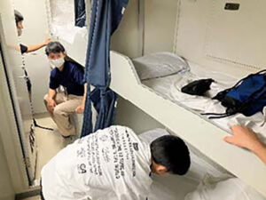 練習船の体験は全員がはじめて。ベッドメイク、食事の配膳や片付け、居住区の掃除も全員の仕事だ。船内には陸にはないさまざまな設備や細かいルールがあるのだが、すべてに安全を第一とした意味があることなどを知っていくのは貴重な体験だ。