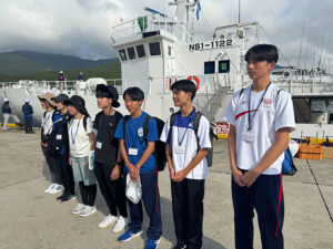 慣れない船中泊で寝不足の生徒たち。翌朝、厳原港が近くなって、全員でデッキに上がってみると対馬CAPPAのみなさんの熱い出迎えが!(対馬CAPPA(対馬Coast and Aquatic Preservation Program Association)は、対馬の海洋環境保全を目的とした一般社団法人で、企業、研究機関、地域団体、学校などと連携し、海洋ごみの発生抑制と普及啓発に取り組んでいます。)
