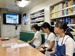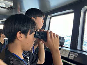 長崎から対馬までの航路で、2つの班にわかれてそれぞれおよそ1時間程度、ブリッジから目視により漂流物を観察する。色や大きさ、位置をタブレットを使って次々と記録していく。大きな「浮き」のような漁具が漂っていく。時折、ペットボトルの「群れ」が流れ、人の生活圏が近づいていることがうかがえる。天候や海流などの影響で、漂流する道があるのかもしれない。生徒たちは意見を交わしながら観察をつづけた。