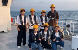 慣れない船中泊で寝不足の生徒たち。翌朝、厳原港が近くなって、全員でデッキに上がってみると対馬CAPPAのみなさんの熱い出迎えが!(対馬CAPPA(対馬Coast and Aquatic Preservation Program Association)は、対馬の海洋環境保全を目的とした一般社団法人で、企業、研究機関、地域団体、学校などと連携し、海洋ごみの発生抑制と普及啓発に取り組んでいます。)