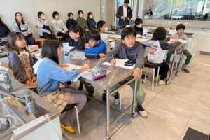 大分県水産養殖協議会の福田穣(ふくだ ゆたか)氏を講師に、「養殖魚の種類」「お魚が持つ栄養素」「養殖魚のできるまでの過程」「養殖魚の餌の変化」などを分かりやすい資料で、丁寧に教えていただきました。はじめは恥ずかしがっていた子ども達も積極的に座学に取り組み、一緒に参加していた親御さんまでもが興味を示すほど楽しい授業となりました。