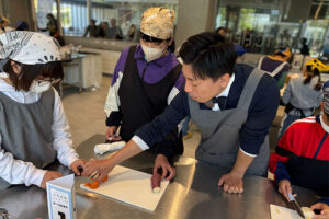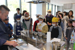 調理に入る前に、魚捌きのプロである塩脇(しおわき)氏にブリの解体ショーを披露して頂きました。ブリ1本を捌く様子を見たことがない子ども達がほとんどで、塩脇さんの見事な包丁さばきに見入っている様子でした。園田先生から「つるりんブリのぶっかけ丼」の作り方を教わった後、班ごとに分かれて調理にチャレンジしました。慣れない包丁に悪戦苦闘しながらもみんなで協力しあって料理を完成させ、自分達で作った料理の美味しさは格別のようで「美味しい!」といった声がたくさん上がっていました。今回の料理教室は、子ども達にとって魚への関心や料理の楽しさを学ぶ良い機会となりました。