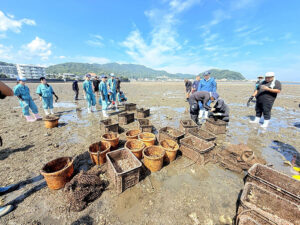 【概要】2023年から大分県と臼杵市が中心となって進めている「臼杵干潟アサリ復活プロジェクト」の一環で、9月8日(月)~9日(火)の2日間行う作業のうち、今回は9月9日(火)に約3万3千個の稚貝の移植作業を実施。(2日で合計約12万3千個の稚貝を移植)