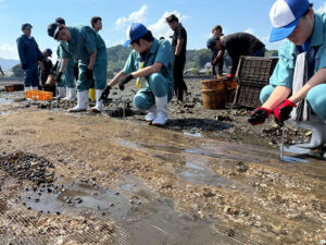 一般社団法人うみらいふは、2025年9月9日(火)、大分県立海洋科学高等学校の生徒とともに、アサリの復活を目指す取り組みとして「アサリ稚貝の放流活動」を行いました。大分県中部振興局の指導のもと、今回は大分県漁協臼杵支店青年部の方々と協力し、他県から仕入れた人工種苗の稚貝(約1センチ)約3万3千個を干潟に移植しました。稚貝を均等に配置した後、被覆網(ひふくあみ)を掛けその日の作業は終了いたしました。今回移植した稚貝は、順調に育てば来春には食用可能な大きさ(約2.5センチ)に成長する見込みです。※被覆網には、ツメタガイやカニなどの天敵による捕食や波浪による散乱を防ぎ、アサリの生残率を高める効果が期待されています。このイベントは、次世代へ豊かで美しい海を引き継ぐために、海を介して人と人とがつながる“日本財団「海と日本プロジェクト」”の一環です。