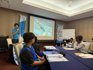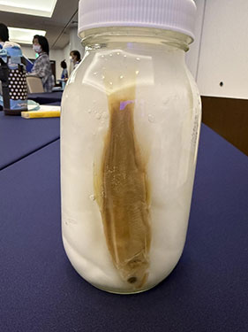 川での活動に続いて、名護市教育委員会学芸員の村田尚史さんからリュウキュウアユの話を聞きました。リュウキュウアユは、沖縄本島と奄美大島にのみ生息するアユで、日本本土産アユの亜種です。沖縄本島では1978年に採集されたものが最後の記録となり絶滅してしまいました。講義では、貴重なリュウキュウアユの標本を見せてもらい、リュウキュウアユが絶滅した理由や復活と自然定着を目指す取り組みなどについて聞きました。「アユ」は岐阜県の県魚であり、とても大切な魚です。環境の変化によってリュウキュウアユが棲めなくなってしまったように、長良川の鮎も川の環境が変われば、棲めなくなる可能性があります。子ども達はあらためて環境を守ることの重要性を学びました。