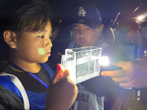 夜は、海辺を散策しながら海のプランクトンを採集しました。プランクトンとは何か、どのように採取するのかなどを、海の環境教育に取り組む「しかたに自然案内」の鹿谷麻夕先生に教えてもらいました。川でうまれたアユの赤ちゃんは、川の流れにのって海まで行き、海のプランクトンを食べながら大きくなり、再び川に戻ってきます。海のプランクトンがアユにとって大切なものと聞き、子ども達は興味津々。波の音や潮の香りも五感を刺激するワクワク、ドキドキの夜の海辺散策となりました。