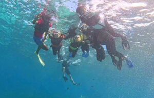 2日目は、サンゴ礁の学習としてシュノーケリングで海の中を観察しました。青く透き通った海にはサンゴをはじめ、たくさんの魚やヒトデなどが生息し、驚きと感動の体験となりました。インストラクターの先生からは、近年、サンゴの白化現象で多くのサンゴが死んでしまっていることや海水温の上昇で魚が棲めなくなっていることなどを聞き、海の美しさとともに、課題を抱える海の現状も知りました。