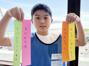 川や海で様々な体験学習を行った子ども達は、感じたことや学んだことを「琉歌」で表現しました。琉歌は、「8・8・8・6」の30音で詠む、沖縄独特の詩歌です。子ども達は、文字数を数えながら、沖縄で学んだことや心に残ったことを短冊に記しました。また、一人一人が作った琉歌をグループで見せ合い、みんなの短冊を組み合わせて、グループごとに新たな琉歌を作りました。