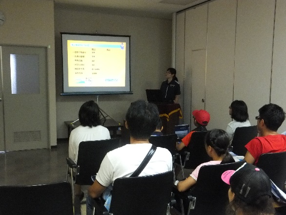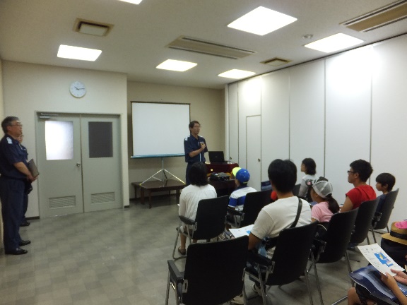 まずはじめに、海上保安庁の担当者から、大阪湾海上交通センターが高いこの地にあることの意味、明石海峡が日本一の船の交通量であること、その船の交通整理をしているのが大阪湾海上交通センターの役割であることをプロジェクターを見ながら説明を受けました。