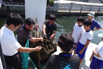 最終日となった8月4日は、築港中学校の参加予定者が学校行事の都合により減ったため、引率教員2名を加えても総勢で6名。少人数での観察会でしたが、この日は最高気温が37.1度を記録し、10時の開始時刻にはすでに30度を越え、炎天下のなか、汗だくで海遊館前の岸壁に沈めておいたカゴと付着板の引き上げ作業となりました。