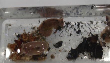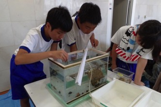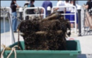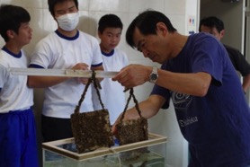 カゴにはムラサキイガイ(ムール貝)が、付着板にはヨーロッパフジツボがびっしりと付着しています。カゴの中にはヘドロがたまって何も見えません。ところが、「魚だ!」「カニだ!」と、ピンセットを使って付着物を探っていた男子諸君から声が上がりました。ドロドロ、グシャグシャな付着物。それでも、「気持ち悪〜い」という声が聞こえていたのは最初だけ。次々とカニが見つかり、水槽に40匹ほど集まった頃には、生徒も引率の先生もカゴの前にしゃがみこんで、“獲物”探しに熱中した生物調査となりました。
