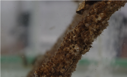 それでも、引き上げた生物は生きていました。観察された生物は、前述のもの以外に、ウミウシの仲間のウミフクロウ、イソギンチャクの仲間、ヒドロ虫(ヒドロチュウ)の仲間、ゴカイの仲間のチロリやタマシキゴカイ、棘皮動物のマヒトデ、ホヤの仲間のカタユウレイボヤ、魚類のクロソイ幼魚など、種類の多さには驚くばかりです。しかも、澄んだ海水に移し替えると、どれも動きが活発になりました。とりわけ、ヨーロッパフジツボの活動には目を見張るものがありました。