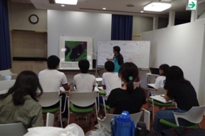 すでに別の環境学習で水質調査した結果をもとに、天保山岸壁、大阪港沖、関西空港島沖、阪南市(大阪湾南東部)の西鳥取漁港の各水域の水色や水温、塩分濃度などの違いを解説。さらに、大阪湾の全体的な海岸動物の分布の特徴や外来種の存在、生物多様性の重要性などについて両講師から講義を受け、2時間半に及んだ最終回は無事に終了。「海の宝アカデミックコンテスト」に応募したいと語る参加者諸君の作品は、きっと、大阪湾の魅力を伝える力作になることでしょう。