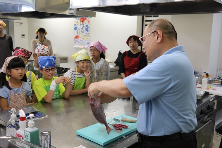 親子10組20人が、名古屋コミュニケーションアート専門の調理実習室に集まり、イベントがスタートしました。講師は、中部水産株式会社顧問の神谷友成です。
