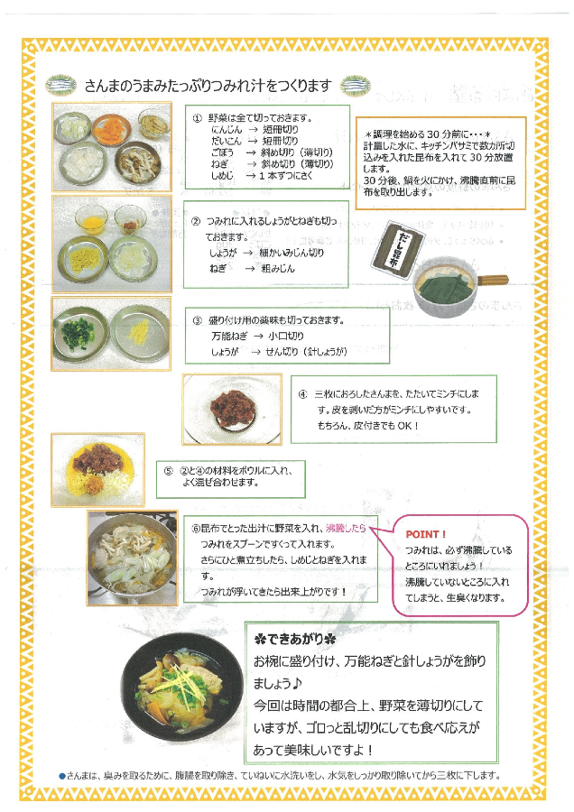 さばいた魚で、「小鯛の姿造り」と「サンマのうまみたっぷりつみれ汁」を作り、おいしくいただきました。 つみれ汁のサンマは、中骨と腹骨を取った後は細かい骨ごとミンチにして、にんじんや大根、ネギにしょうがなど、具だくさんで体が温まるつみれ汁に仕上がりました。