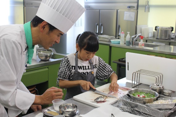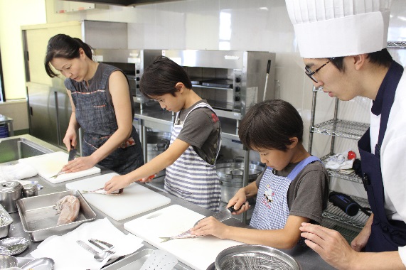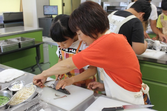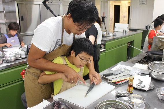 続いて実際に参加者が魚を調理。慣れない包丁を使う子どもたちを心配そうにご両親が見守る中、子供たち一人ひとりが真剣に1匹のアジをさばきました。