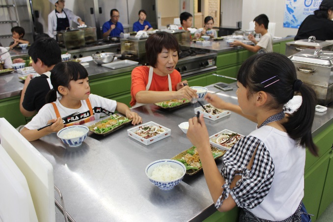さばいた魚を使って「アジの甘酢ソースがけ」と「イカの緑茶蒸し」を調理。静岡県民になじみの深い緑茶を料理に使うことで、静岡県ならではのメニューとなりました。調理を終えて、自分たちで作った料理を食べるときには達成感のせいか、笑顔が見られました。