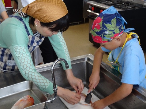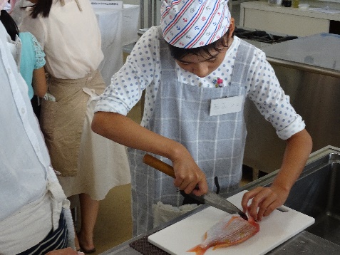 さばく前の下処理(うろこ取り)や三枚おろしなど、学校の先生や生徒のアドバイスを受けながらレンコ鯛をさばきました。頭はお吸い物、身は蒸し物(けんちん巻)と余すところなく全ていただきます。中には保護者のサポートを受けず、頑張る児童の姿もありました。「将来の夢はお寿司屋さん」ということで夢中になってさばいていました。