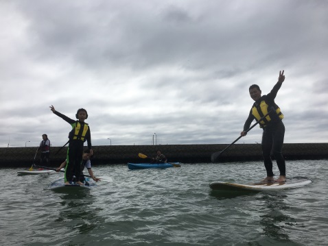 青空も見られ気温も予報よりも上がり、シーカヤックとSUP体験をしていただくことができました。水が大好きな子どもはSUPから何度も飛び込んで違う海遊びになったりしてましたが、シーカヤックではオールを一生懸命こいでました。